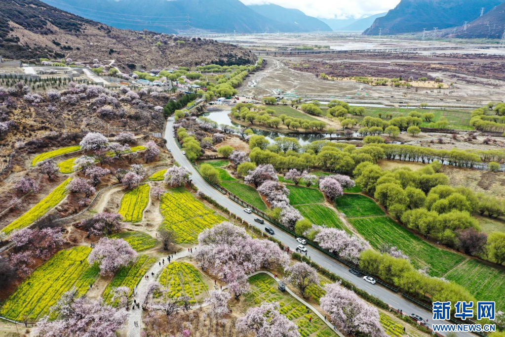 3月31日,林芝市巴宜區(qū)嘎拉村盛開的桃花(無(wú)人機(jī)圖片)。新華網(wǎng)發(fā) 李騰 攝