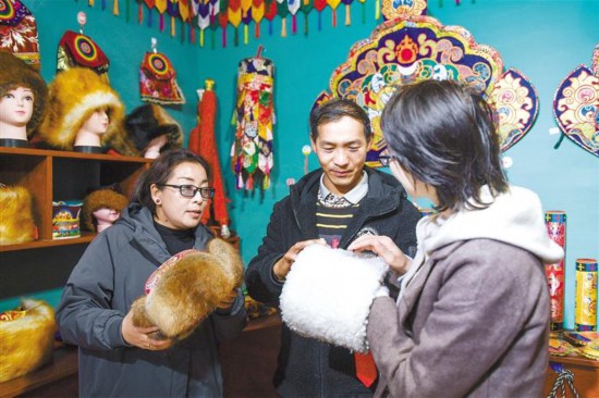 圖為拉薩市尼木縣吞普村二組曲果婦女縫紉農(nóng)民專業(yè)合作社的工作人員向游客介紹產(chǎn)品。記者 丹增群培 攝