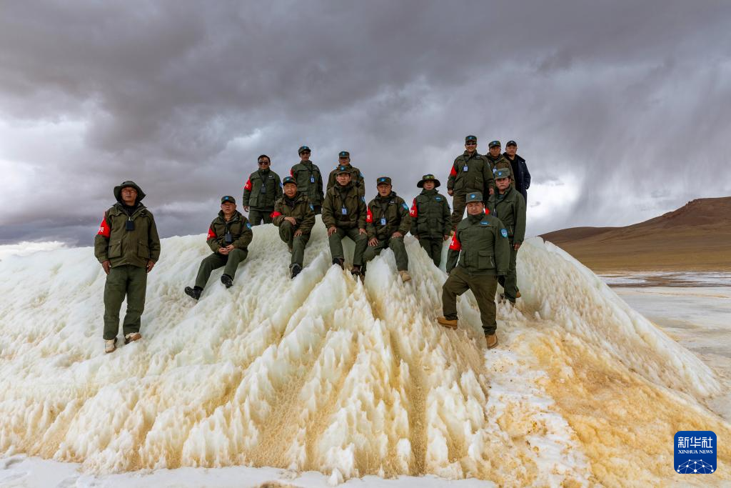 野生動(dòng)物專業(yè)管護(hù)隊(duì)員在巡護(hù)路上一處埡口的冰雪堆上合影(5月7日攝)。新華社記者 姜帆 攝 ??
