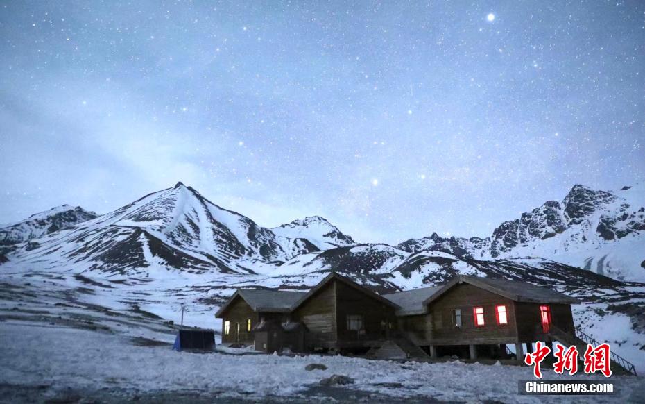近日,記者嘗試攀登了白雪皚皚的青海省海北藏族自治州門源回族自治縣境內(nèi)的崗什卡雪峰。崗什卡雪峰面積約450平方公里,又稱“冷龍嶺”,是祁連山主峰之一,海拔在4000米—5000米之間,海拔4500米以上多有現(xiàn)代冰川,冰川總面積約80平方公里。圖為晚間的崗什卡雪峰露營基地。陳宏年 攝