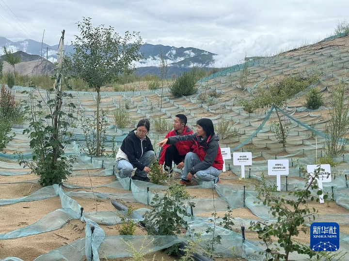 中國科學(xué)院成都山地災(zāi)害與環(huán)境研究所研究員周萍帶領(lǐng)研究生在西藏扎囊縣沙化土地生態(tài)治理綜合示范區(qū)開展沙地試驗(yàn)樣方植被生長狀況監(jiān)測。新華社記者 顧天成 攝