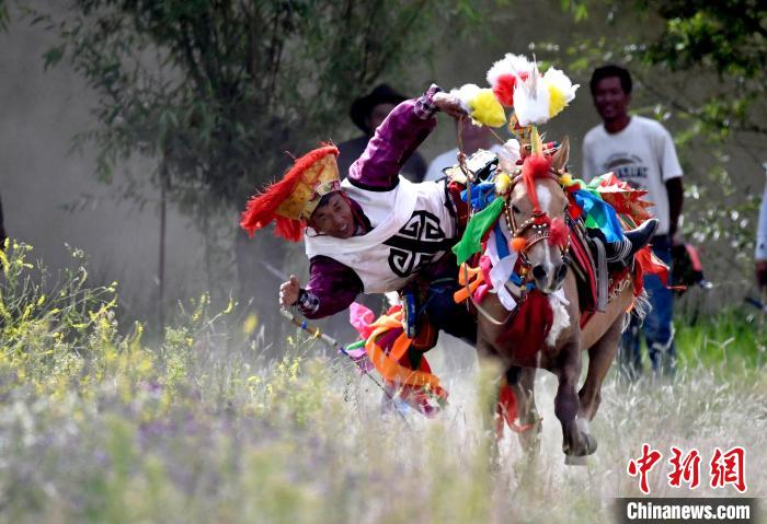 7月27日,西藏拉薩市桑達(dá)村迎來“望果節(jié)”,村民們舉行賽馬活動(dòng)慶祝?!巴?jié)”是西藏傳統(tǒng)的豐收節(jié),具體日期隨各地莊稼成熟的時(shí)間而變化?!巴?jié)”期間,按照習(xí)俗,各地都會(huì)舉辦賽馬比賽。圖為騎手進(jìn)行馬術(shù)表演。中新社記者 李林 攝