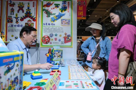 8月7日,臺灣博士兒實業(yè)有限公司總經(jīng)理葉國義(左)在展覽現(xiàn)場演示益智教具。中新社記者 江飛波 攝