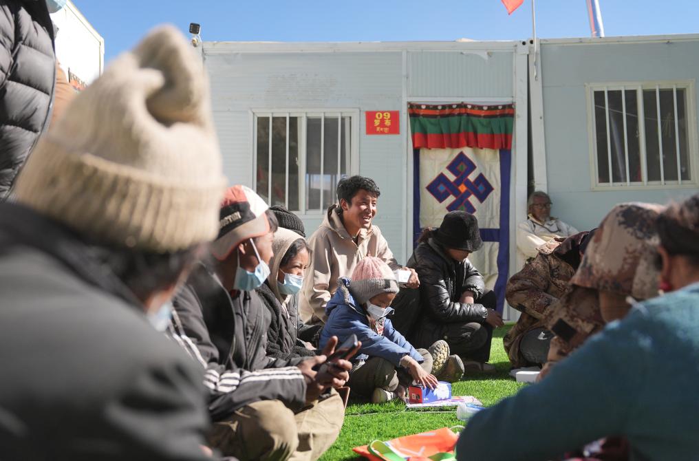 古榮村村委會主任桑杰(中)在安置點(diǎn)和群眾閑聊。新華社記者 晉美多吉 攝