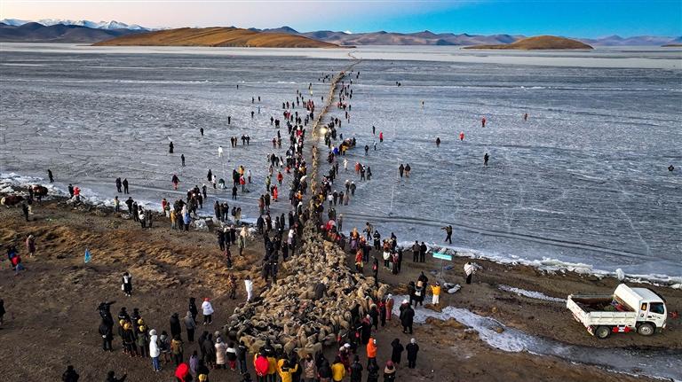 2月7日凌晨,西藏山南市浪卡子縣打隆鎮(zhèn)推瓦村旁的普莫雍措湖面上,夜色未退,一群村民打著手電筒,沿著用牛糞灰鋪就的冰路,穩(wěn)步將數(shù)百只羊趕往湖心島。這一延續(xù)千年的“冰湖趕羊”傳統(tǒng),是當(dāng)?shù)啬撩衽c自然和諧共處的智慧碩果,也承載著普莫雍措獨(dú)特的歷史記憶。在這里,冰面的湛藍(lán)裂紋、牧羊人的質(zhì)樸堅(jiān)守與游客的由衷贊嘆相互交融,共同講述著有關(guān)生存、傳承和敬畏自然的故事?!霸诟篙叀⒆孑吥菚r(shí)候,羊群是村民們賴(lài)以生存的根本;如今,趕羊活動(dòng)帶來(lái)的旅游熱潮依然是大家維持生計(jì)的重要支撐。所以,我想跟推瓦村的年輕人說(shuō),一定不要忘記這項(xiàng)傳統(tǒng),不要舍棄這些給我們帶來(lái)富足生活的羊群?!蔽榻鸬┰鰸M(mǎn)懷深情地說(shuō)道。