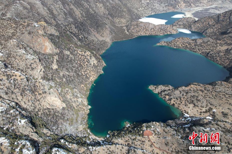 2月16日,位于西藏昌都市邊壩縣的“三色湖”在群山環(huán)抱中景色壯美?!叭庇珊诤缀?、黃湖組成,群山環(huán)抱中的三處相鄰湖泊在陽(yáng)光下分別呈現(xiàn)不同色彩。圖為三色湖景色。中新社記者 李林 攝(無人機(jī)照片)