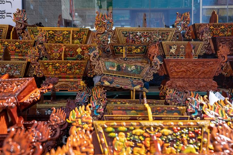 “老板,這個切瑪盒多少錢?便宜點我就拿走了?!薄斑@個圖案樣式都是精心雕刻的,最低1300元,實在不能再少了。”次仁的店鋪前,不少顧客正在挑選“切瑪盒”,生意很是火爆。“切瑪盒”是將精制斗形木盒用隔板分開,左右兩邊分別盛入炒青稞和糌粑,再插上象征五谷豐登的“羅薩梅朵”和寓意吉祥的酥油花,寓意人壽年豐、吉祥如意,是藏歷新年家家戶戶必備的年貨之一。次仁告訴記者,“切瑪盒”根據(jù)圖案、顏料、大小、木材等因素,售價從幾百元到上千元不等,很多顧客普遍喜愛傳統(tǒng)樣式與圖案。