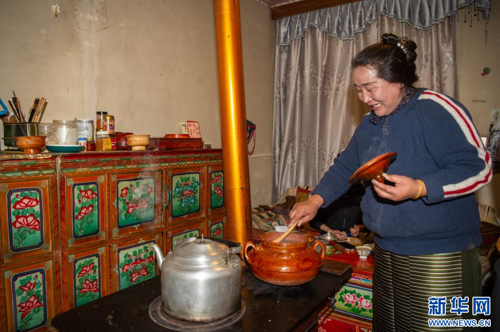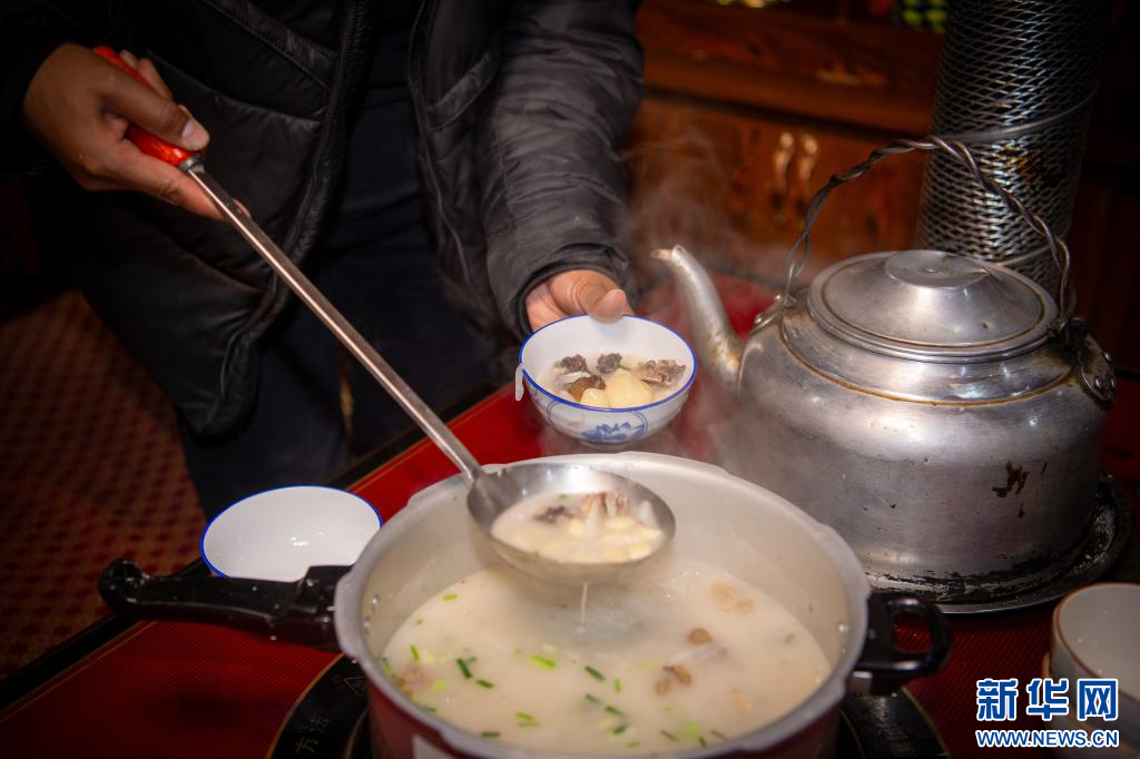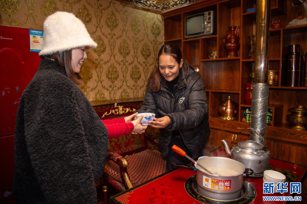 2月27日,扎西曲登社區(qū)33號(hào)民宿的民宿管家給游客盛“古突”。新華網(wǎng) 旦增努布 攝
