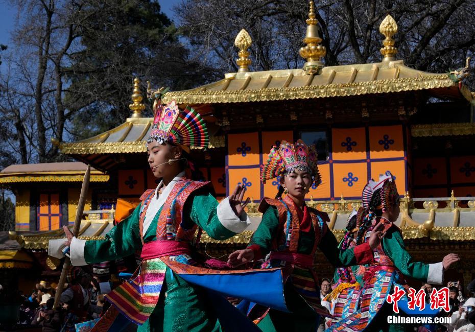 2月28日是2025年藏歷木蛇新年的第一天,市民游客在拉薩市羅布林卡內吃切瑪、寫對聯(lián)、看藏戲,歡度藏歷木蛇新年。圖為少兒藏戲《朗薩雯波》演出現(xiàn)場。中新社記者 李林 攝