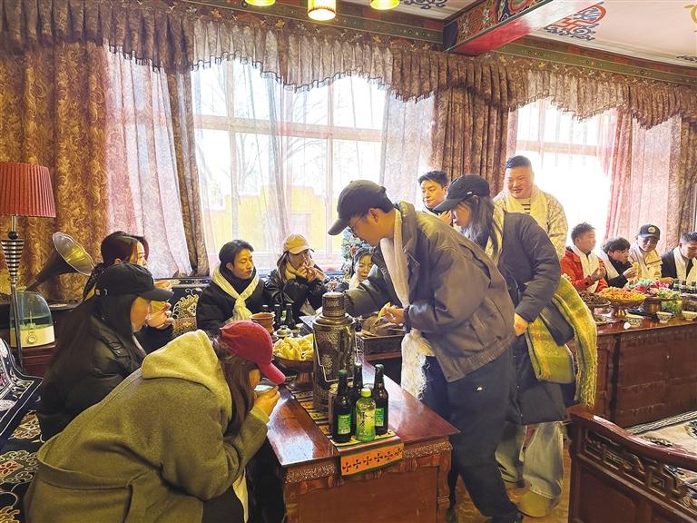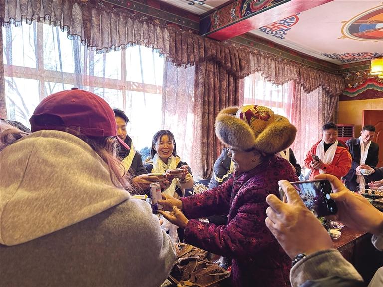 來(lái)自東北遼寧的于先生是第一次過(guò)藏歷新年,一切都讓他感到新奇不已。他一邊不停地拍照,分享給遠(yuǎn)方的家人,一邊興奮地介紹說(shuō):“我不僅品嘗到了美味的藏式佳肴,更深入了解了藏歷新年習(xí)俗,這份跨越文化的溫暖與情誼,將成為我記憶中最珍貴的新年禮物,希望明年還有機(jī)會(huì)過(guò)藏歷新年?!庇谙壬脑?huà)語(yǔ),道出了許多游客的心聲。在這個(gè)特別的新年里,他們收獲的不僅僅是美食與美景,更是一份深厚的文化體驗(yàn)和溫暖的情誼。