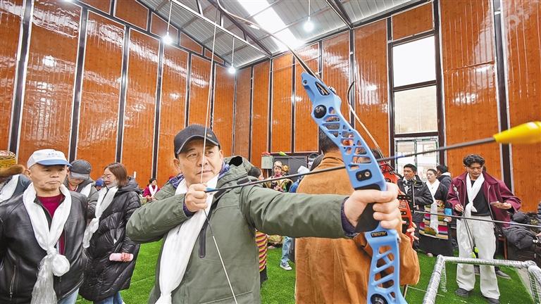 游客在扎日鎮(zhèn)體驗(yàn)當(dāng)?shù)貍鹘y(tǒng)體育項(xiàng)目——響箭。