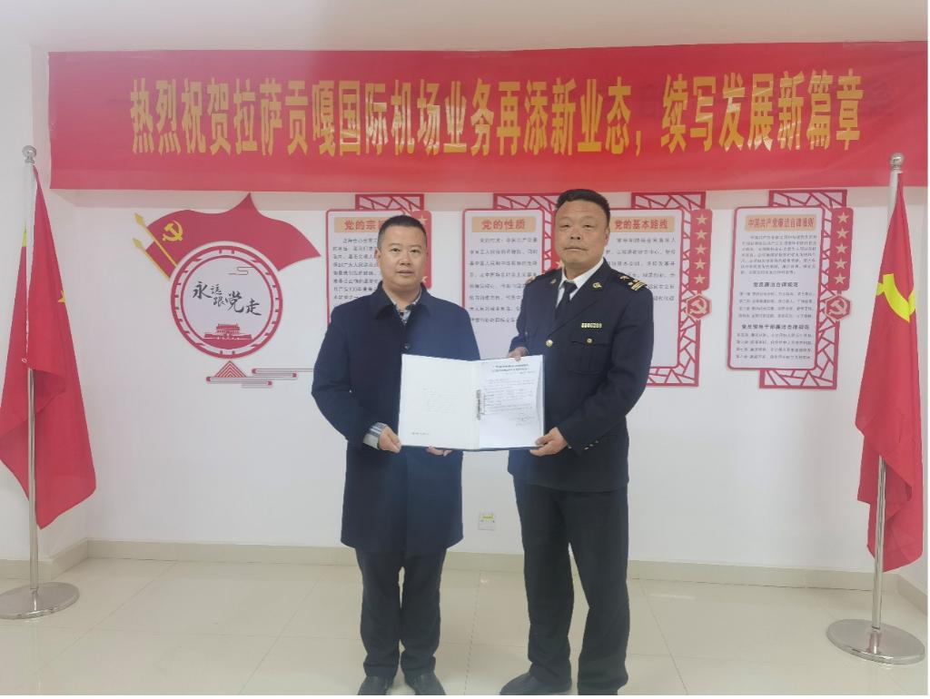 3日,拉薩海關(guān)負(fù)責(zé)人向西藏機(jī)場(chǎng)集團(tuán)貨運(yùn)部負(fù)責(zé)人頒發(fā)海關(guān)監(jiān)管貨物倉儲(chǔ)企業(yè)注冊(cè)登記證書。(拉薩海關(guān)供圖)