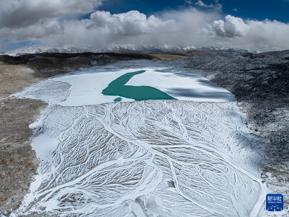 4月13日拍攝的普拉喜瓊峰腳下的曲隆嘎木措冰川湖(無人機(jī)照片)。新華社發(fā)(董志雄攝)
