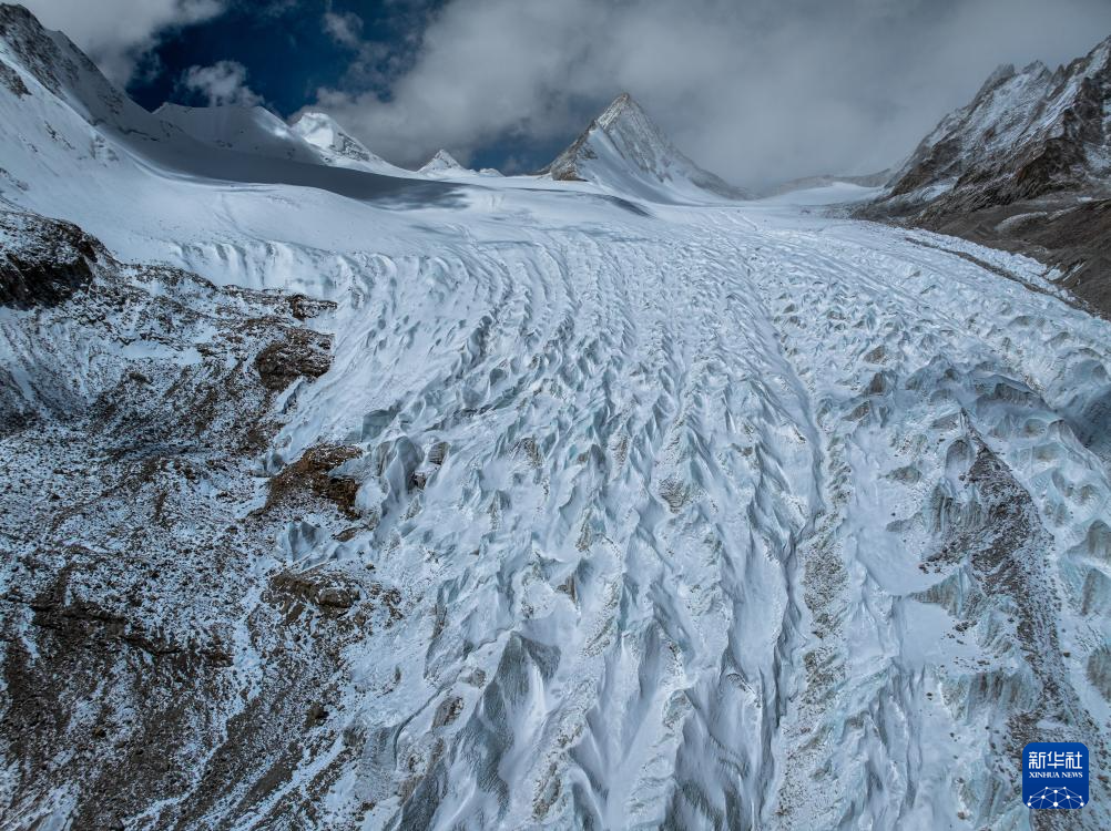 空中俯瞰普拉喜瓊峰腳下的曲隆嘎木冰川(4月13日攝,無人機(jī)照片)。新華社發(fā)(董志雄攝)