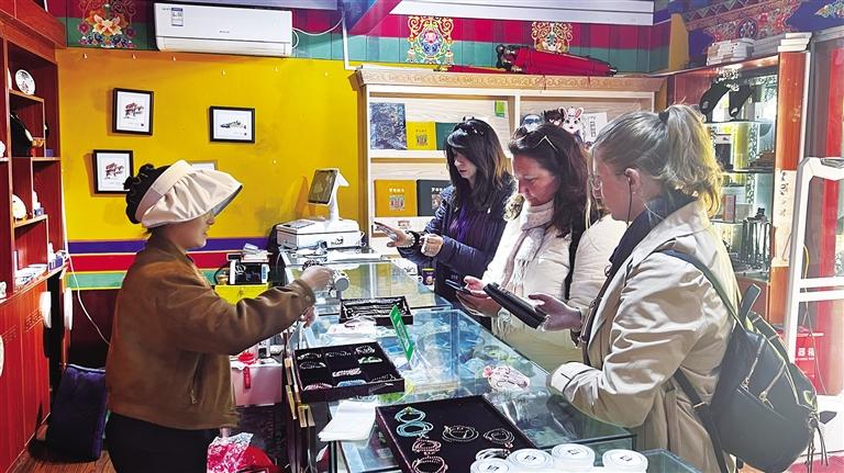 國際旅行商在文創(chuàng)店內(nèi)購買紀(jì)念品。