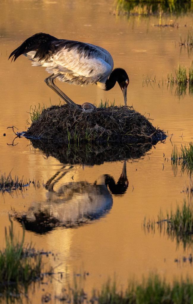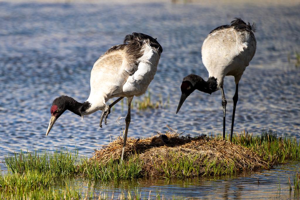 資料記載,黑頸鶴壽命大約為10到15年,通常一生中只有一個配偶;繁殖期在每年的5月至7月,求偶時伴隨著舞動與共鳴——雙雙把頭伸向前方,彼此呼應(yīng)并發(fā)出“咯咯咯”的響聲,這一行為相當于每年一次的“求婚”儀式。黑頸鶴營巢于水環(huán)繞的草墩上或茂密的蘆葦叢中,一窩卵通常有2枚。