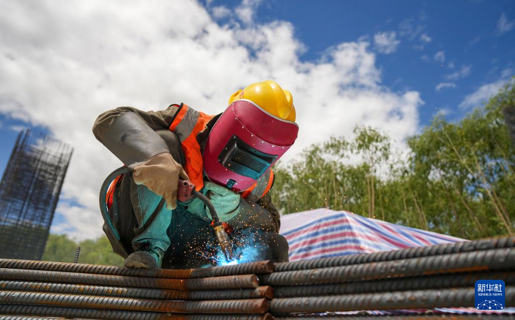 工人在薩熱路跨江大橋建設(shè)現(xiàn)場(chǎng)焊接鋼筋(6月18日攝)。新華社記者 晉美多吉 攝 ??
