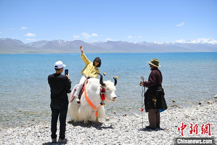 圖為游客在納木錯湖邊拍照游玩。中新社記者 貢嘎來松 攝