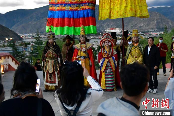 圖為《文成公主》大型實(shí)景劇演員在文成公主藏文化風(fēng)情園巡游,與游客互動。李林 攝