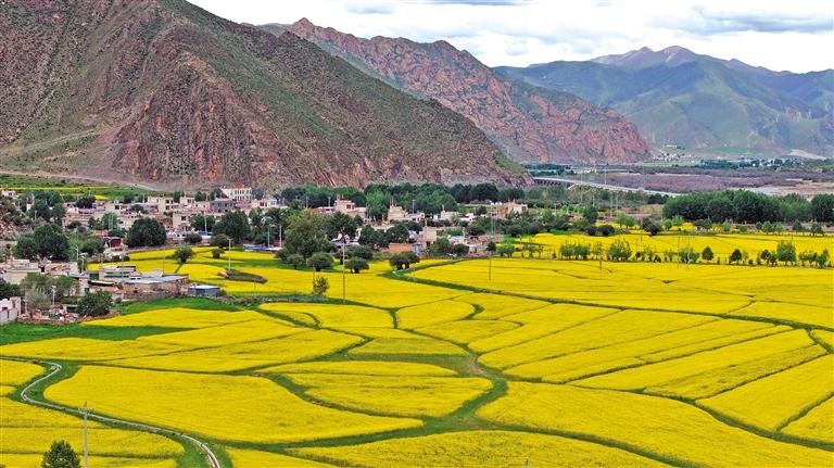 盛夏時節(jié),拉薩市墨竹工卡縣的萬畝油菜花迎來盛花期,金黃色的花海與高原特有的藍天白云相映成趣,構(gòu)成一幅壯美的自然畫卷。近年來,墨竹工卡縣適度擴大油菜種植規(guī)模、舉辦油菜花旅游推介會等,大力發(fā)展小菜籽油特色產(chǎn)業(yè),推動產(chǎn)業(yè)發(fā)展和群眾增收致富。