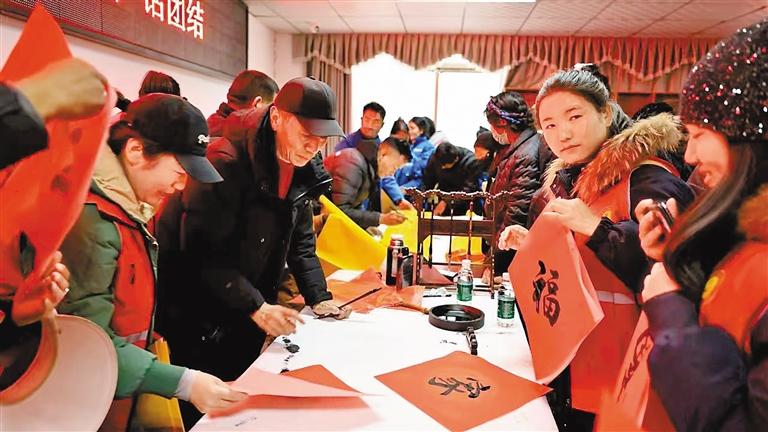 加查縣新時(shí)代文明實(shí)踐中心開(kāi)展“鬧元宵 話團(tuán)結(jié)”活動(dòng),志愿者們與群眾一同用毛筆書(shū)寫(xiě)美好寄語(yǔ)。