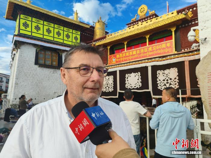 8月19日,法國游客Jean Francois在大昭寺前接受采訪。中新社記者 楊程晨 攝