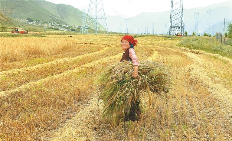 圖為該縣唐加鄉(xiāng)卓村村民在使用機械收割,并進行青稞裝袋。記者 格桑倫珠 攝