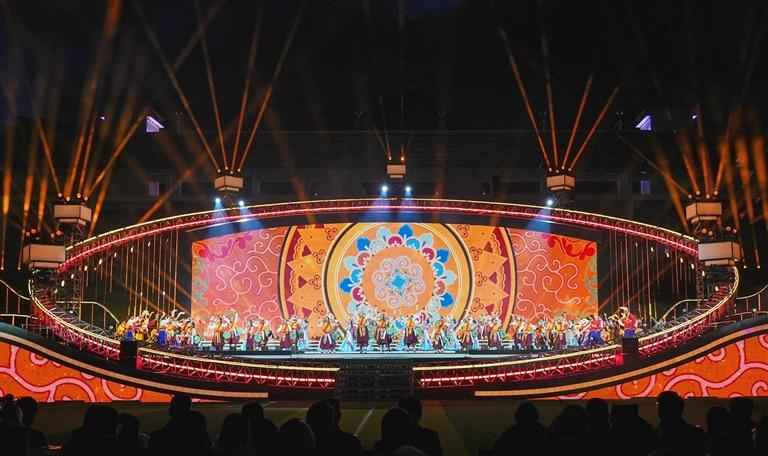 舞臺設(shè)計同樣暗藏巧思,主體采用巨型“同心圓”架構(gòu),設(shè)計中巧妙嵌入藏族傳統(tǒng)建筑的經(jīng)典紋樣,同時將山南的人文風(fēng)貌與山水景致融入其中,讓地域特色與藝術(shù)美學(xué)自然交融。
