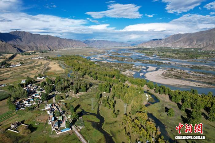 9月20日,拉薩河畔神秘樹林風光,據(jù)悉該樹林以前為荒灘。(無人機畫面)中新社記者 江飛波 攝