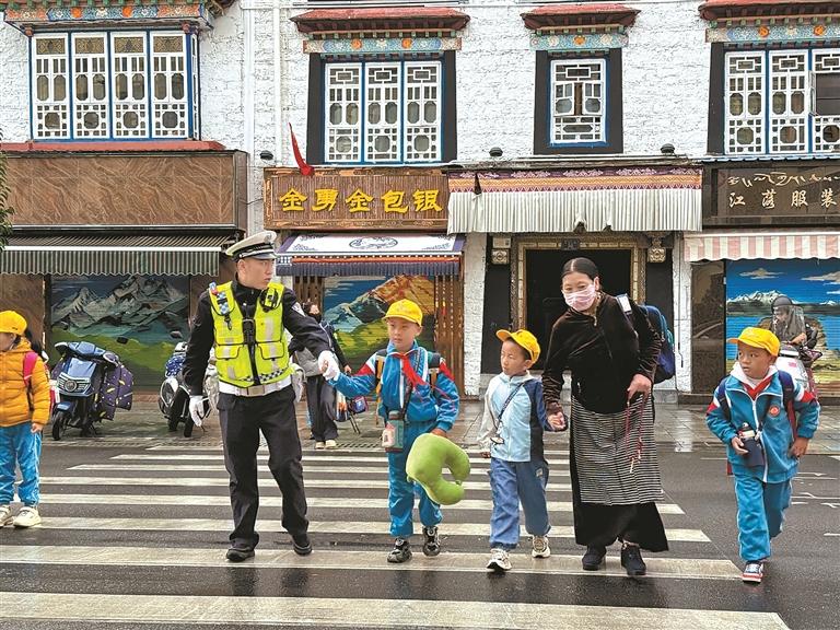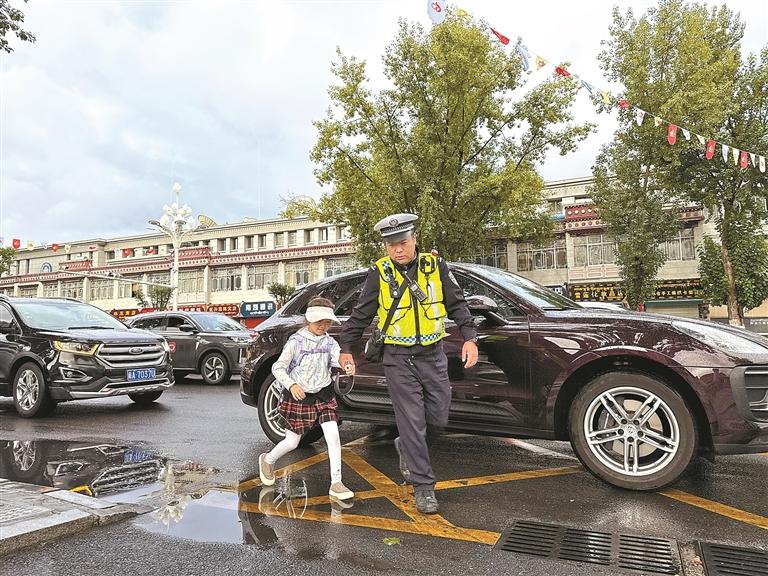 圖為拉薩市公安局交通管理支隊(duì)民警幫助獨(dú)行的學(xué)生穿過(guò)車流。記者 鹿麗娟 攝