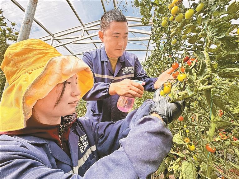 圖為昌都市貢覺縣現(xiàn)代農(nóng)業(yè)產(chǎn)業(yè)園區(qū)內(nèi),技術(shù)員在大棚內(nèi)教授當(dāng)?shù)厝罕娦》逊N植技術(shù)。記者 白瑪澤旺 次仁平措 攝