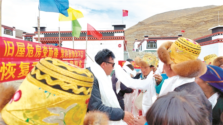 圖為拉洛鄉(xiāng)塔村村民向包村干部和施工隊(duì)隊(duì)員敬獻(xiàn)哈達(dá)。記者 扎西頓珠 攝