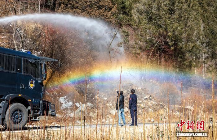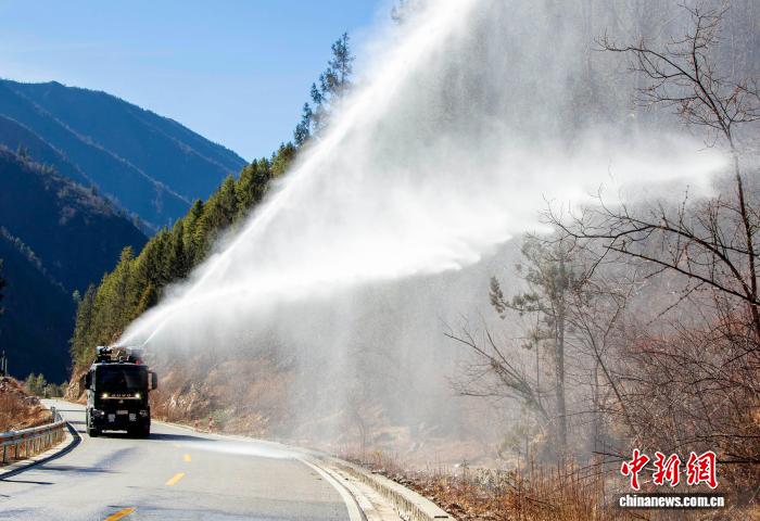 圖為西藏亞東出入境邊防檢查站開展灑水增濕現場。李錦輝 攝