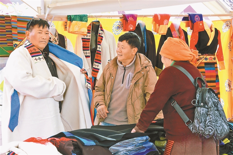 來自達(dá)孜區(qū)邦堆鄉(xiāng)的普珍阿佳,帶著自家以傳統(tǒng)方法釀制的青稞酒,吸引了不少新老主顧前來購買;“90后”創(chuàng)業(yè)者達(dá)瓦將藏式紋樣與現(xiàn)代設(shè)計(jì)相結(jié)合,制作出的新潮手機(jī)殼、帆布包,成為年輕人爭相選購的“尖貨”;書法家桌前排起長隊(duì),他們或送春聯(lián)、或?qū)憽案!弊?;藏戲、民歌表演的舞臺前更是掌聲不斷。