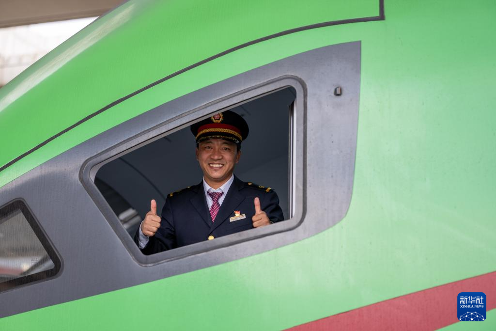 2月14日,斯朗旺扎和他駕駛的“復(fù)興號(hào)”動(dòng)車組留影。新華社記者 旦增尼瑪曲珠 攝