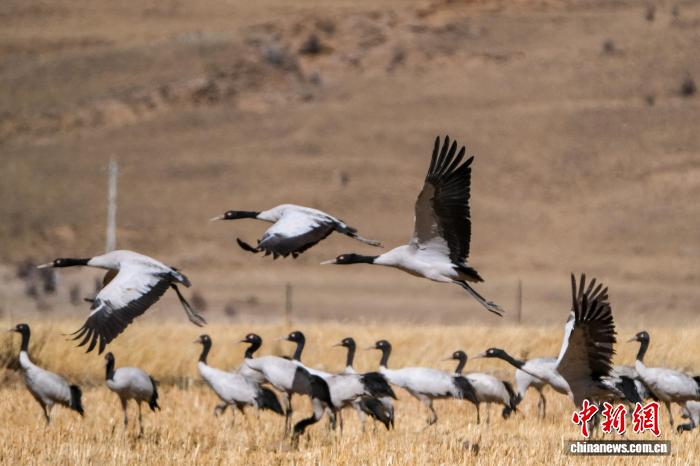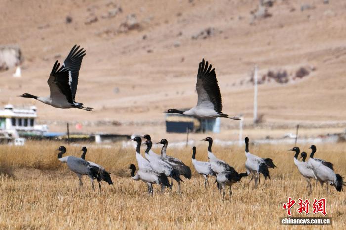 黑頸鶴是中國(guó)國(guó)家一級(jí)保護(hù)動(dòng)物,是唯一生活、繁殖在高原的鶴類(lèi),被藏族民眾譽(yù)為“吉祥鳥(niǎo)”。近日,西藏自治區(qū)拉薩市林周縣林業(yè)和草原局介紹,作為黑頸鶴重要的越冬棲息地,今年該縣境內(nèi)黑頸鶴數(shù)量在1800只至2300只之間,其中虎頭山水庫(kù)卡東村一帶占比約一半。中新網(wǎng)記者在周邊看到,不少黑頸鶴在田間覓食,不時(shí)飛翔于高原農(nóng)田、村落上空,舞動(dòng)的鶴影和聲聲鶴鳴為冬春時(shí)節(jié)的高原增添了幾分靈動(dòng)。圖為2月8日,黑頸鶴群在悠閑覓食。江飛波 攝