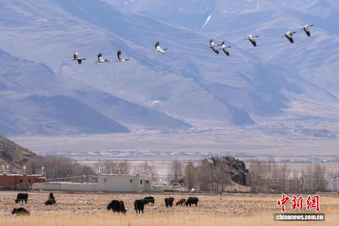 圖為2月8日,翱翔的黑頸鶴群與高原牦牛以及村落組成一幅優(yōu)美的畫(huà)面。江飛波 攝