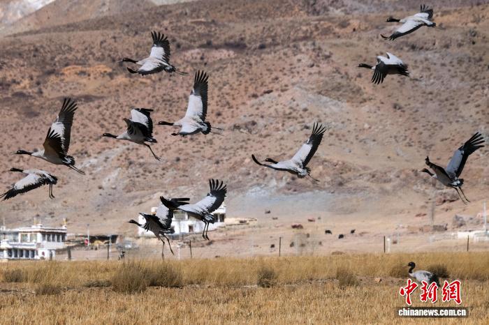圖為2月8日,黑頸鶴種群飛翔在高原農(nóng)村周邊。江飛波 攝