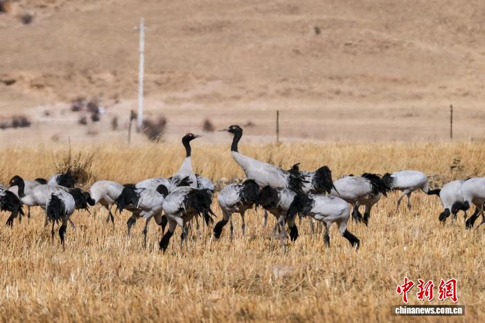 圖為2月8日,一大群黑頸鶴在高原悠閑覓食。江飛波 攝