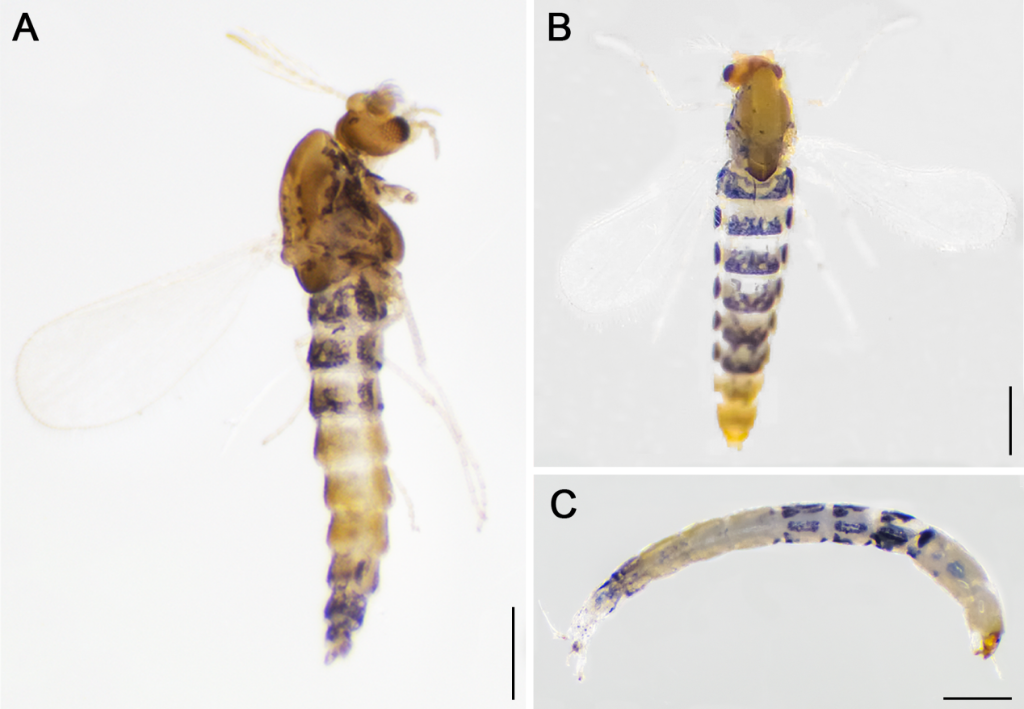 圖為墨脫流施密搖蚊整體照:A為雄成蟲、B為雌成蟲、C為幼蟲。(西藏自治區(qū)高原生物研究所“達娃創(chuàng)新工作室”供圖)
