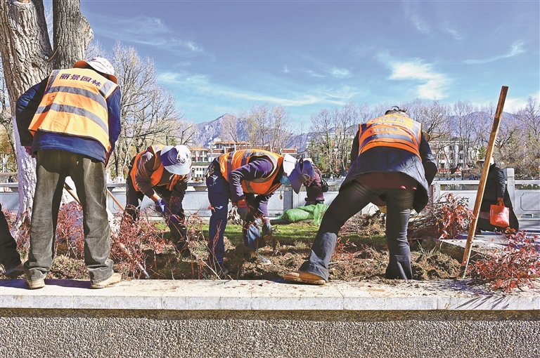陽春三月,雪域高原春意漸濃。在拉薩市區(qū)的一處公園綠地內(nèi),園林工人們正搶抓春季綠化黃金期,開展苗木栽植作業(yè)。圖為工人在栽植苗木。記者 唐斌 攝