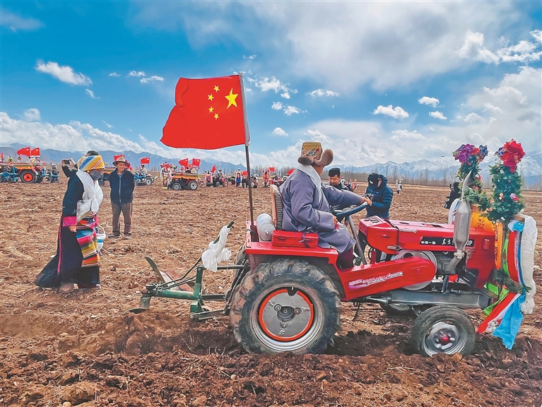 開耕儀式上,村民身著節(jié)日盛裝,聚在田間地頭,拖拉機(jī)等農(nóng)機(jī)設(shè)備擦拭一新,機(jī)頭鮮艷的五星紅旗迎風(fēng)招展。大家捧出切瑪盒,一字排開,互獻(xiàn)哈達(dá)、互敬青稞酒、同唱祝福歌,每個(gè)人臉上都洋溢著對豐收年景的期盼。
