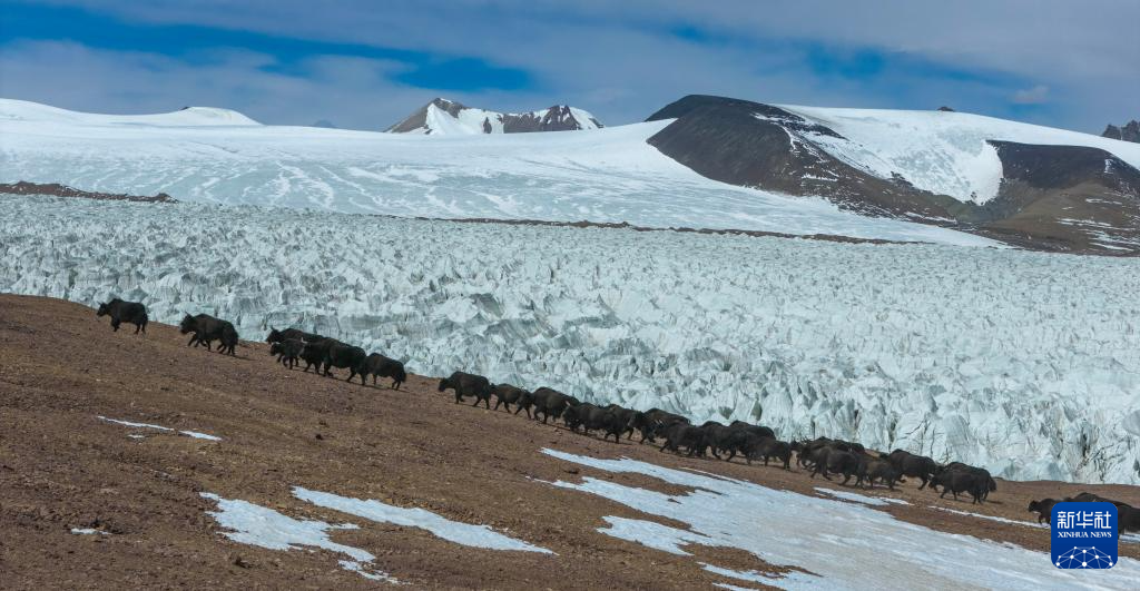 野牦牛群從藏色崗日冰川旁走過(guò)(無(wú)人機(jī)照片,3月10日攝)。新華社發(fā)(四郎江村攝)