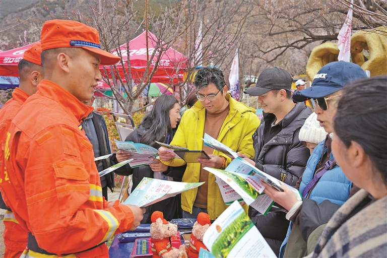 春和景明,桃花漸次綻放,各地游客紛至沓來,景區(qū)用火風險也同步攀升。為了切實筑牢防火安全防線,近日,林芝消防救援機動支隊巴宜大隊深入巴宜區(qū)林芝鎮(zhèn)嘎拉村,在游客集散點、桃花林核心區(qū)域設(shè)立定點防火宣傳點,通過漢藏雙語展板、宣傳手冊和現(xiàn)場講解,向游客普及森林防火知識與應急避險技能。同時,組建流動宣傳小隊,利用廣播宣講、沿街提醒等方式,將消防安全知識延伸至游客步道、商戶,確保宣傳無死角、全覆蓋。此外,執(zhí)勤人員攜帶風力滅火機、組合工具等專業(yè)裝備,沿著陡峭的步道和林區(qū)小徑展開拉網(wǎng)式巡查,確保遇有突發(fā)情況能夠快速響應、高效處置。