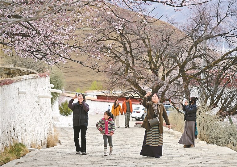 春日的帕邦喀,桃花競(jìng)相綻放,灼灼芳華鋪滿(mǎn)山間。粉白相間的花海層層疊疊,將古樸建筑掩映其中,勾勒出別樣的詩(shī)意畫(huà)面。游人漫步花海小徑,或駐足賞花,或拿起相機(jī)定格美景,歡快的笑聲與清幽的花香相互交織,奏響了高原春日里的動(dòng)人樂(lè)章。