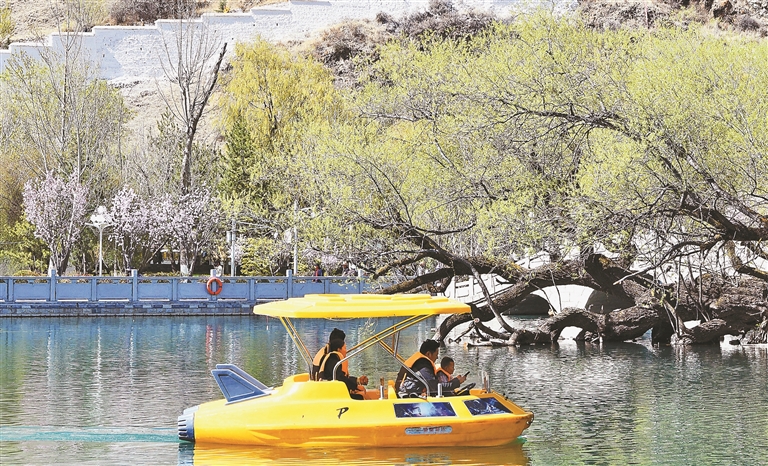市民在宗角祿康公園劃船。記者 旦增蘭澤 攝