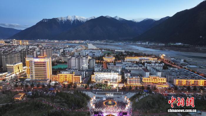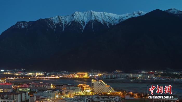 4月3日晚,西藏林芝市城市夜景美,城市建筑、街道的燈光與雪山相映成趣,景色美麗。(無(wú)人機(jī)照片)中新社記者 貢嘎來(lái)松 攝