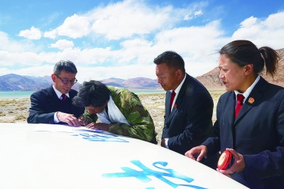 在阿里地區(qū)班公湖旁,常年驅(qū)車穿行于高山荒漠辦案的基層法官們?yōu)橛龅诫y題的牧民布曲真送來了調(diào)解書。布曲真與工程公司有勞務(wù)糾紛,經(jīng)法院訴前調(diào)解終于達(dá)成協(xié)議。事情解決了,法官們也開心地笑了。光明日報記者 劉宇航攝