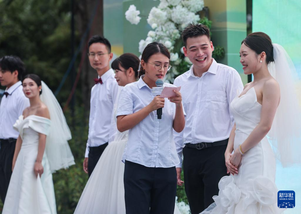 8月20日,新人在諸暨市東白湖鎮(zhèn)斯宅村參加集體婚禮。新華社記者 徐昱 攝