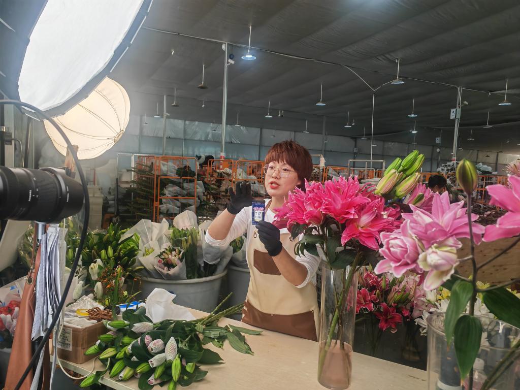 在昆明國(guó)際花卉拍賣交易中心附近,近年來(lái)新建了許多鮮花直播間,主播每天在各電商平臺(tái)直播售賣鮮花。記者在昆明夢(mèng)境供應(yīng)鏈有限公司的直播基地看到,多個(gè)直播間正在售賣玫瑰、百合花等。